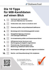 Seit kurzem haben wir 10 Tipps für MBI-Kandidaten – oder Menschen, die sich mit dem Gedanken befassen, als Nachfolger bereitstehen zu wollen – verfasst. In klar verständlichen Formulierungen haben wir 10 Tunkte zusammengetragen und Handlungsempfehlungen dazu formuliert. In unserem Ratgeber finden sie den gesamten Artikel mit allen 10 Tipps.
